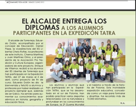 Los Programas Educativos desarrollados por la Asociación Pro Tradición y Cultura Europea recibieron los elogios del alcalde de la Ciudad de Torrevieja y del concejal de Educación, quienes encomiaron la riqueza educativa-cultural de sus expediciones. El Alcalde invitó a los jóvenes a seguir participando en viajes de fin de curso como el desarrollado en Polonia a través de la Expedición Tatra I: 2012.