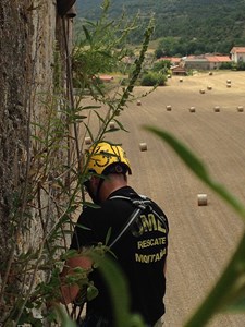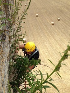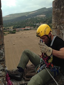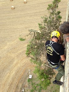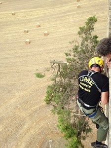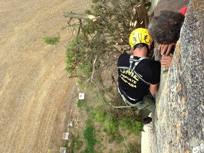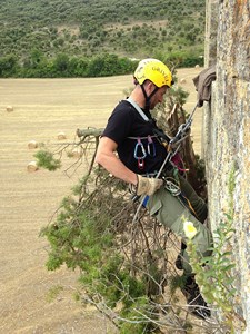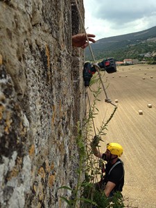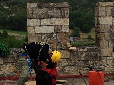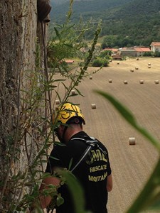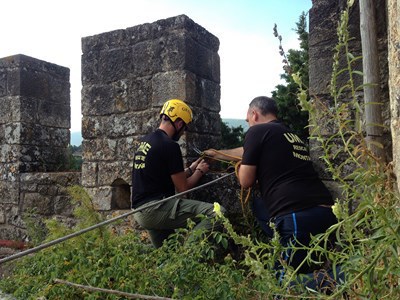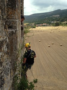 Miembros voluntarios de las Unidades Militares de Emergencia y Rescate en Montaña han montado unos anclajes provisionales de escalada en la Torre Castillo de Valdenoceda de Los Lara Villamor para