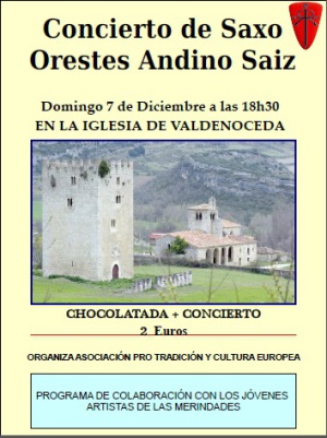 El pasado domingo 7 de diciembre de 2014, se celebró un concierto de saxofón ofrecido por Orestes Andino en la Iglesia románica de San Miguel del S.XII que se encuentra en la localidad de Valdenoceda puerta de entrada al Valle de Valdivielso conocido como el "Valle del Románico" protegido por la Fortaleza Castillo de Lara Villamor del S.XIII-XIV.